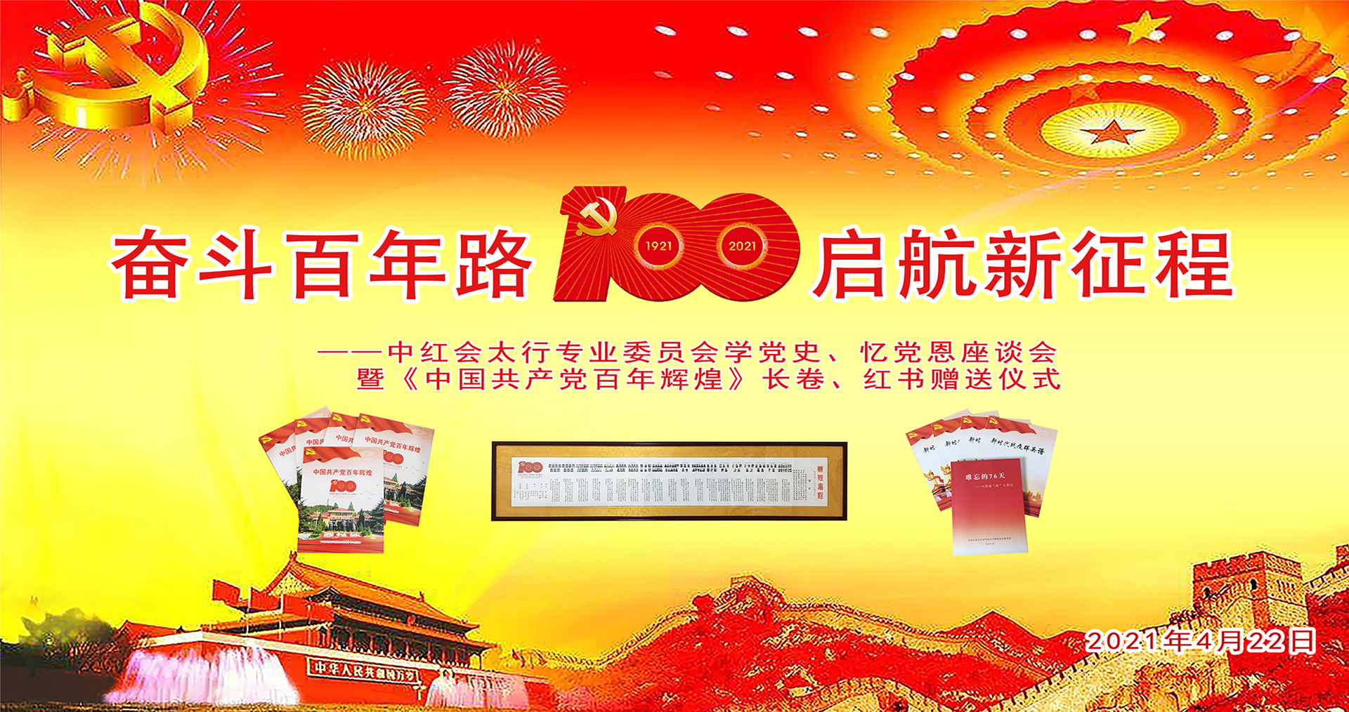 為慶祝中國共產(chǎn)黨建黨100周年,積極響應黨史學習教育的開展,4月22日上午,中國紅色文化研究會太行精神專業(yè)委員會舉行學黨史·憶黨恩座談會暨《輝煌里程》長卷、《中國共產(chǎn)黨百年